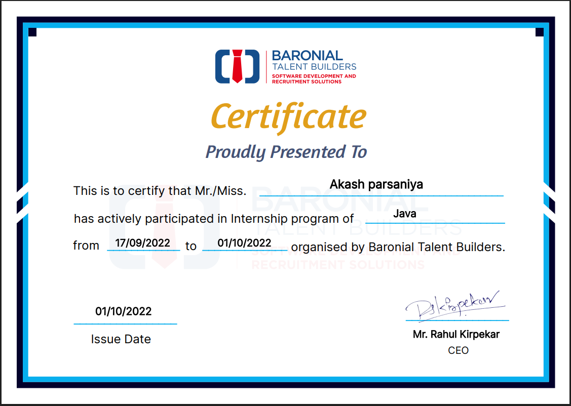 During my internship at Royal Technosoft, I completed hands-on training in Core Java and gained a strong foundation in OOP concepts, collections, and exception handling. I also learned the basics of Spring Boot and worked on building simple RESTful APIs and backend applications.