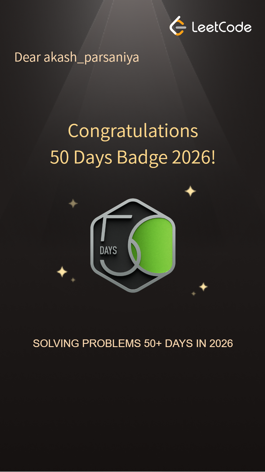 I solved coding problems on LeetCode for 50+ days in 2026.The badge proves that you are regularly practicing Data Structures & Algorithms (DSA).
