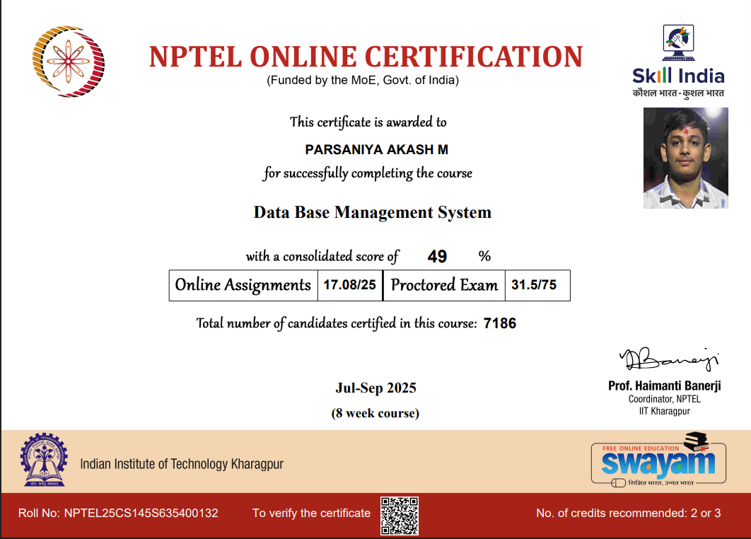 National Programme on Technology Enhanced Learning certification from IIT, demonstrating academic excellence in technology.